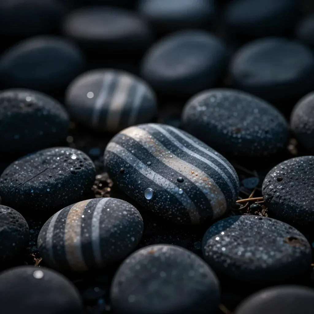A close-up of dark pebbles speckled with white, illuminated by diffused moonlight, creating highlights and reflections. The shallow depth of field and blurred background emphasize the texture and glossy surface of the pebbles.