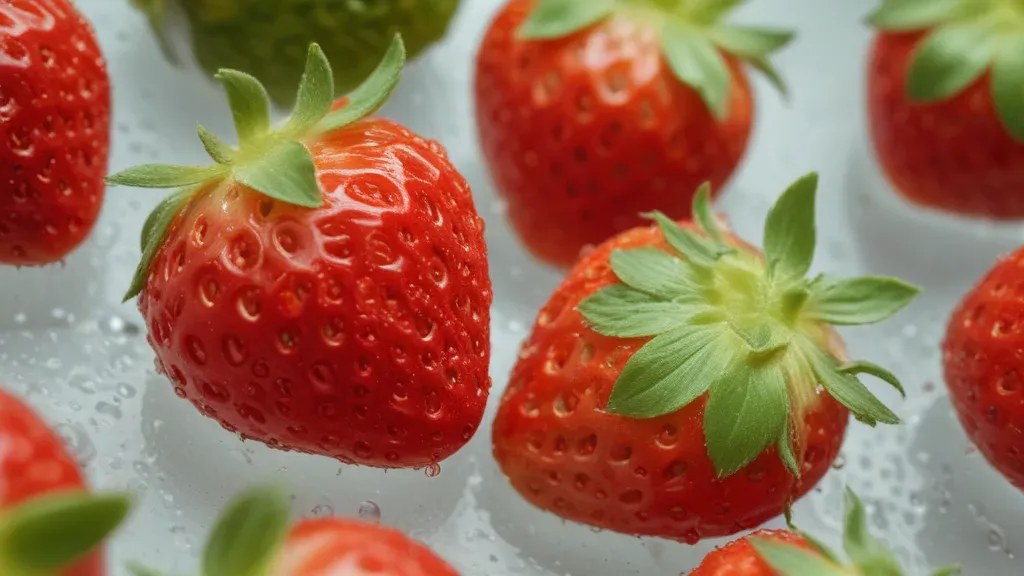 Close-up of vibrant red strawberries glistening with water droplets, illuminated by soft, diffused light from above, creating a fresh and inviting visual. The clean white background and shallow depth of field emphasize the berries, making it ideal for culinary or food advertising.