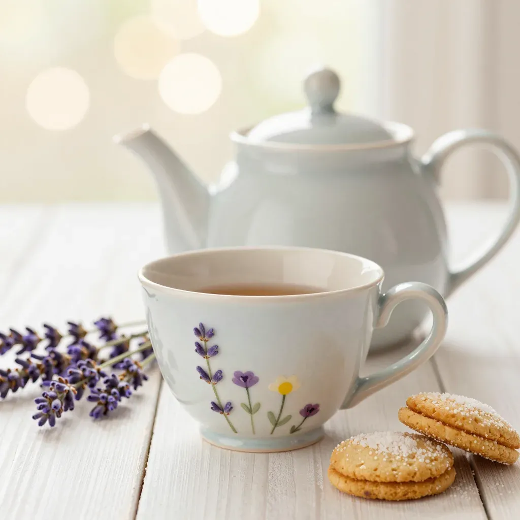 A serene arrangement of a porcelain teapot and teacup with delicate lavender sprigs, set against soft, diffused light from a window, creating a cozy, inviting atmosphere. The balanced composition and gentle lighting highlight the smooth textures and warm tones of the scene.