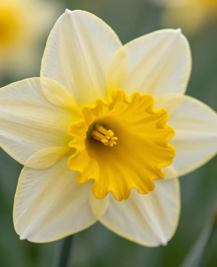 A close-up of a creamy white daffodil with a vibrant yellow trumpet, softly lit by diffused sunlight, highlighting the delicate texture and color of the flower. The blurred green foliage in the background provides a serene natural setting.