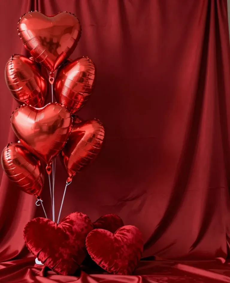 Glossy heart-shaped balloons and plush heart pillows rest on a rich, textured crimson silk backdrop, illuminated by soft, diffused light that enhances their vibrant red hues and creates a warm, inviting glow. The balanced composition and rich textures offer a luxurious and romantic aesthetic, ideal for Valentine's Day or romantic themes.