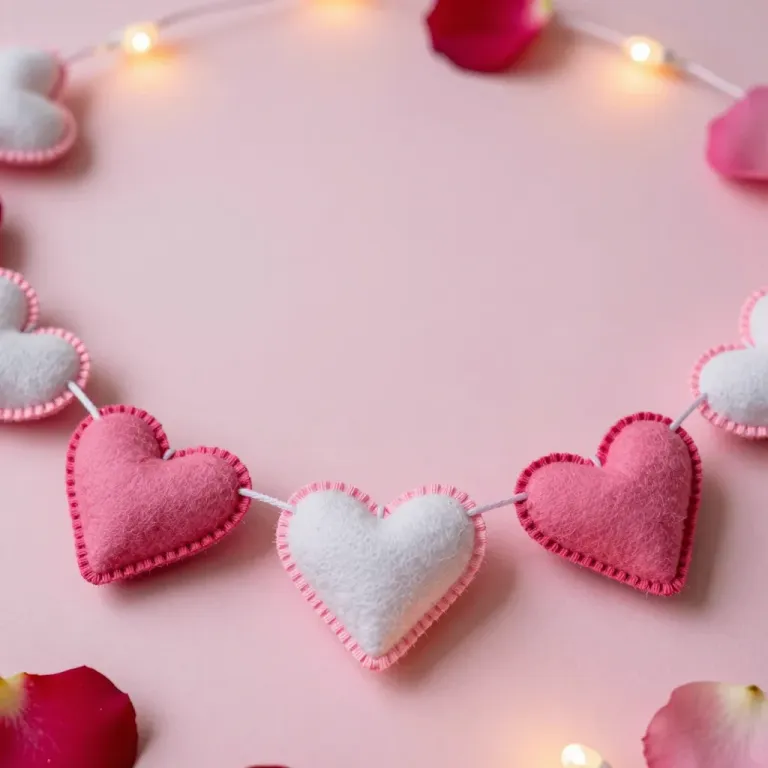 A circular arc of soft pink and white felt hearts, stitched with delicate edges, is strung with warm fairy lights and scattered with velvety rose petals. The shallow depth of field emphasizes the central hearts against a clean, pastel pink background with subtle shadows adding dimension.