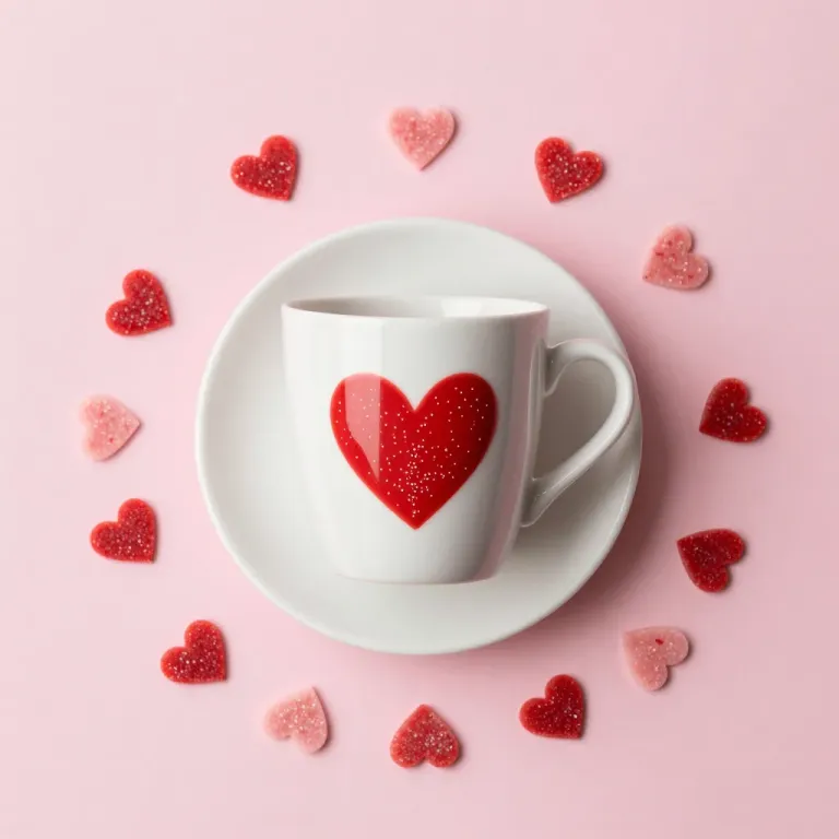 A white ceramic mug adorned with a red glitter heart sits on a matching saucer, surrounded by scattered paper hearts in red and blush pink. Soft overhead lighting creates subtle highlights and gentle shadows, with a top-down perspective and shallow depth of field enhancing the central focus and radial composition.