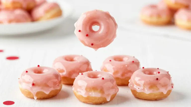Close-up of raspberry-glazed donut holes with red sprinkles, showcasing a smooth, glossy glaze under soft, diffused lighting that creates gentle highlights and shadows, emphasizing the texture and vibrant colors against a white wooden background.