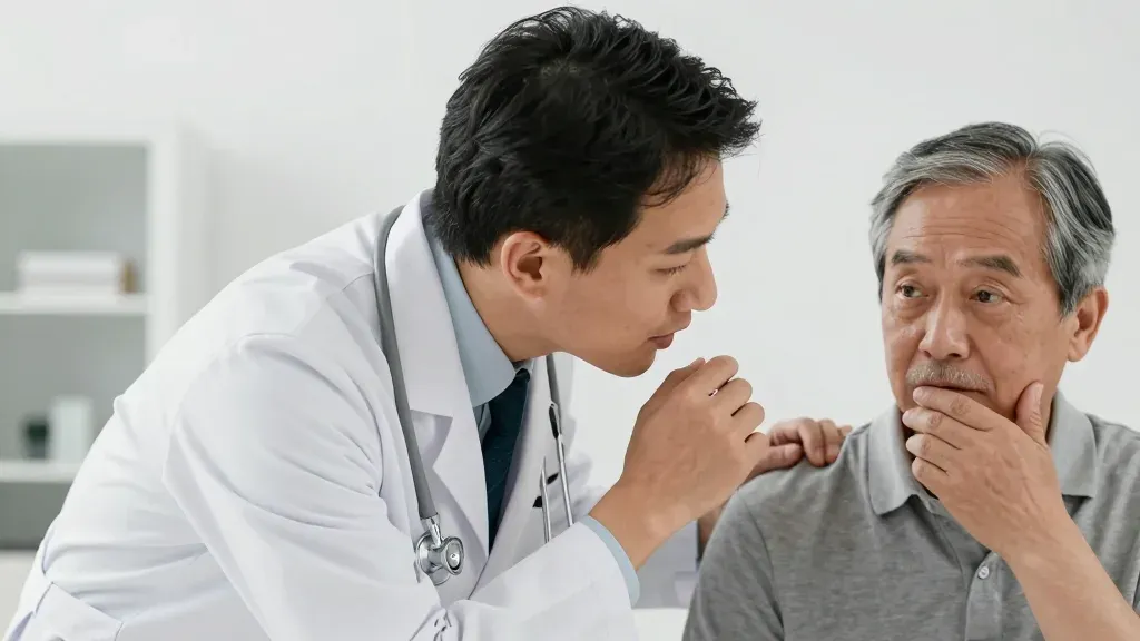 A doctor in a white lab coat leans in closely to whisper to an elderly patient, focusing on the interaction with soft, diffused lighting and a shallow depth of field that blurs the background examination room, emphasizing the intimate and professional atmosphere.