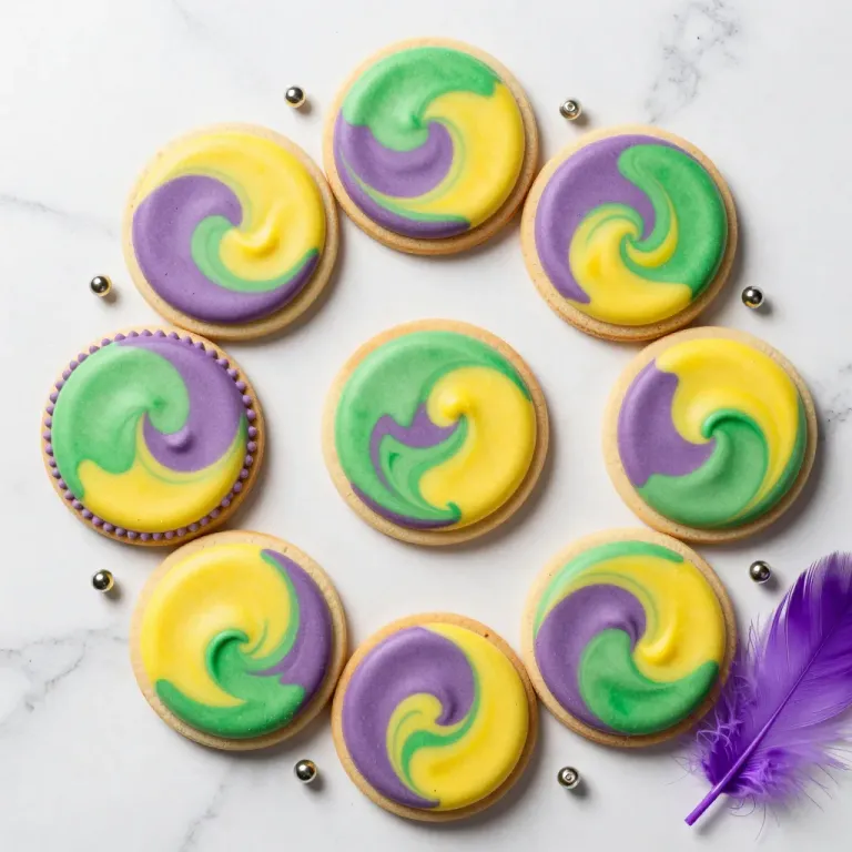 Soft, glossy frosted sugar cookies arranged in a circular pattern, showcasing vibrant swirls of purple, yellow, and green icing under soft, diffused lighting that highlights the glossy texture. The clean white marble background enhances the vivid colors of the cookies, making them pop visually.