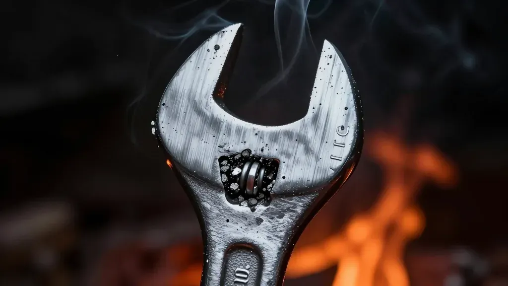A weathered steel wrench holds a charred coal emitting faint smoke, its pitted surface marked by soot and oxidation under dynamic firelight. The centered close-up with shallow depth of field isolates the wrench against blurred flames, emphasizing texture and form.