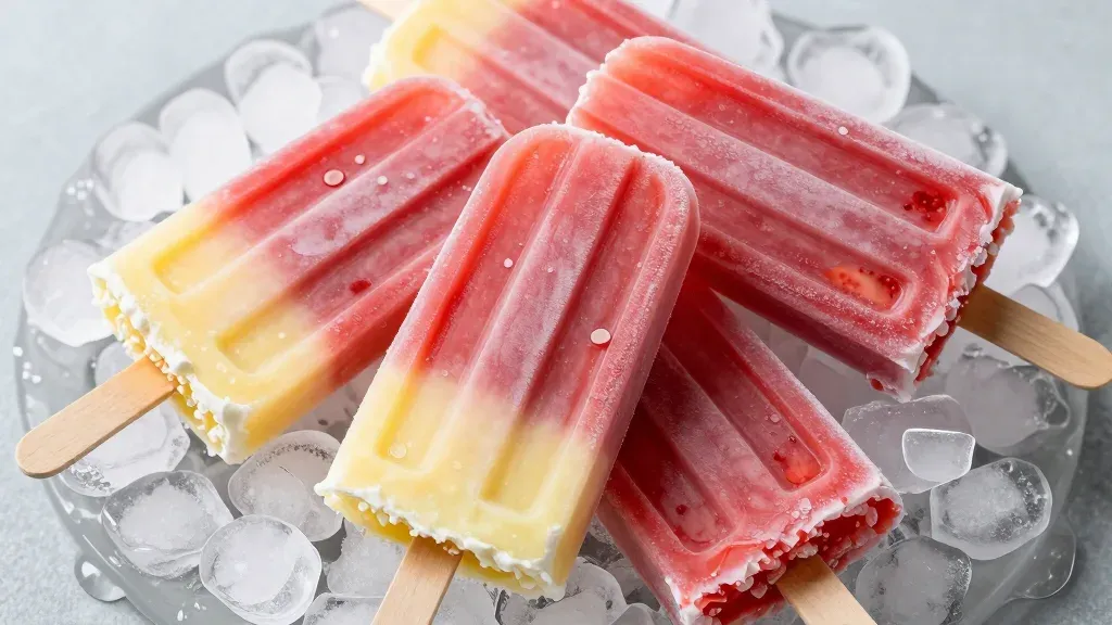 Homemade strawberry and lemon popsicles with smooth, creamy layers and rough ice, softly lit to highlight glossy surfaces and create subtle shadows. The clean and refreshing background of crushed ice on a glass plate provides a perfect backdrop for this refreshing treat.