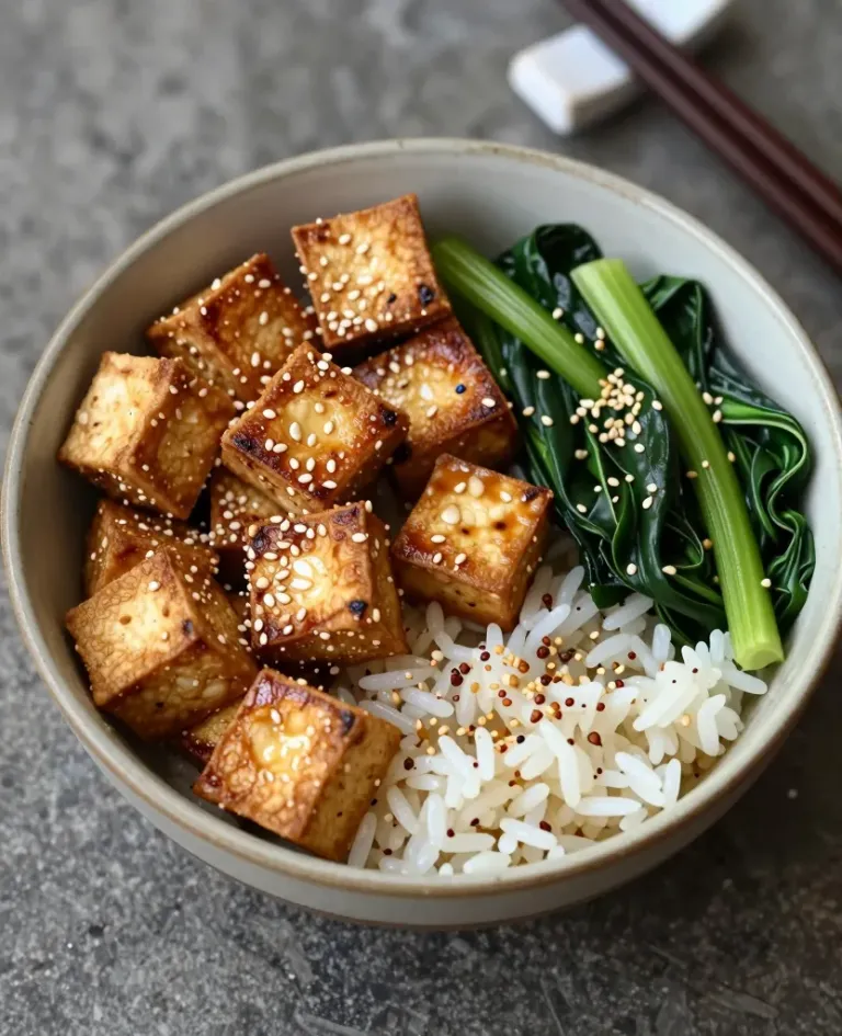 A bowl of crispy tofu, fluffy steamed rice, and fresh greens, bathed in soft natural light that highlights the textures and vibrant colors, creating a balanced and visually appealing arrangement. The neutral background ensures the focus remains on the food, making it perfect for culinary and food photography.
