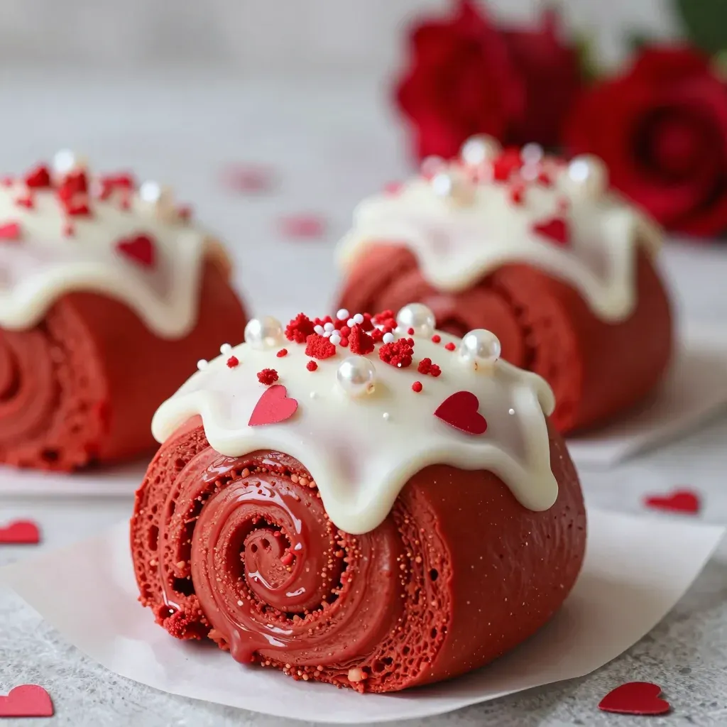 Soft, velvety red velvet rolls are adorned with glossy white icing and decorative sprinkles, creating a visually appealing and festive presentation. The warm, diffused lighting highlights the glossy icing and creates a cozy, inviting atmosphere, while the shallow depth of field blurs the background of red roses and scattered heart-shaped sprinkles, emphasizing the rolls as the focal point.