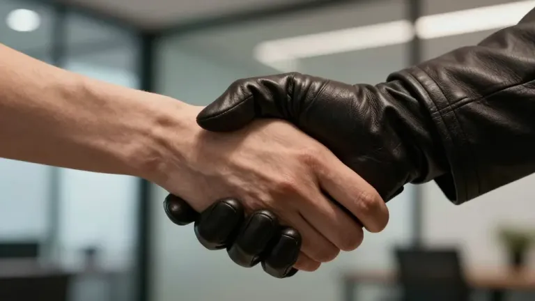 Two hands, one in a glossy black leather glove and the other bare, meet in a firm handshake. Soft, diffused lighting highlights the textures and creates gentle shadows, emphasizing the professional setting.