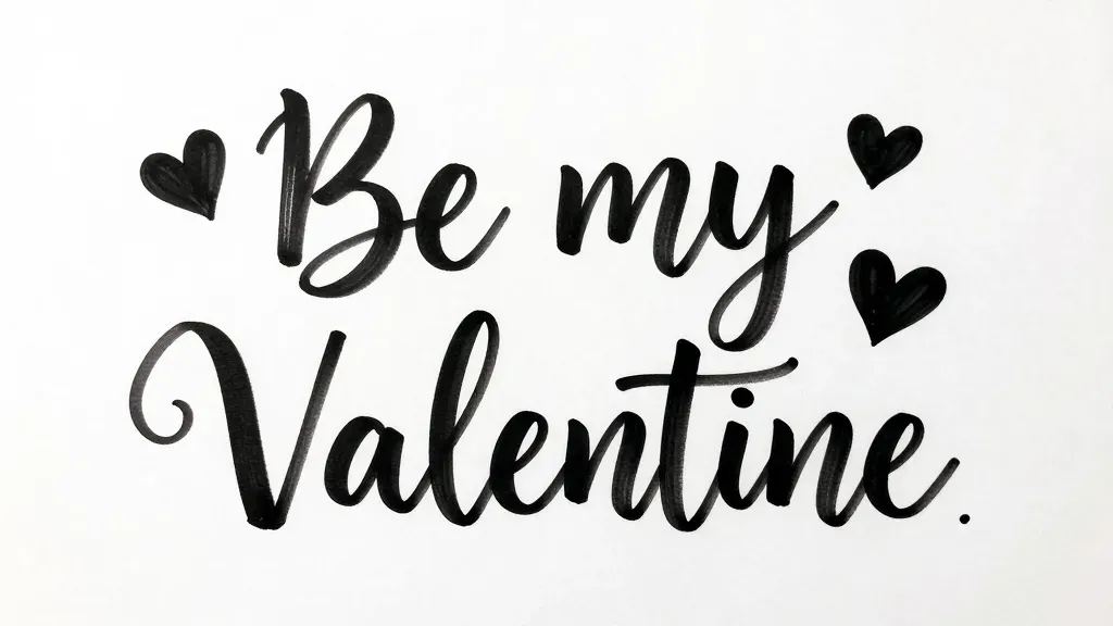 A glossy black ink phrase 'Be my Valentine' with heart symbols is elegantly centered on a clean white background. The even lighting highlights the smooth texture of the ink and the balanced composition ensures ample copy space for design integration.