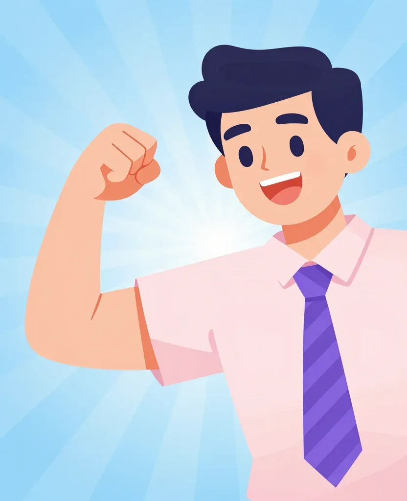 A cheerful businessman flexes his bicep, showcasing his muscular arm against a radiant blue background. The soft lighting highlights the smooth texture of his shirt and the crispness of his tie, creating a shallow depth of field that draws attention to the subject.