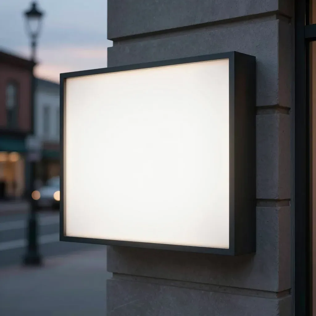 A square lightbox emits soft, diffused light, casting a warm glow on a textured stone wall, creating a serene urban evening ambiance. The blurred background of a quiet street scene adds depth and context to the image.