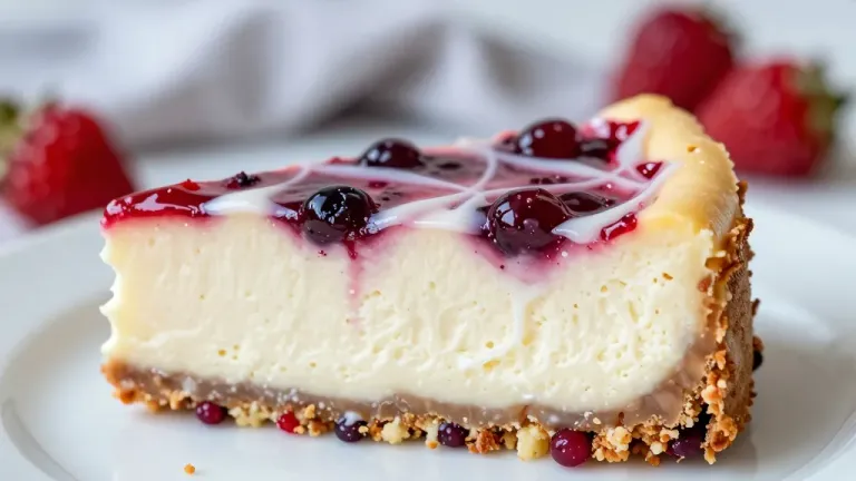 A close-up of a creamy cheesecake slice with glossy blueberry and strawberry swirls, topped with delicate white icing drizzle, set against a soft, diffused light that highlights the vibrant colors and glossy surface. The blurred background of strawberries and cheesecake slices adds depth and context, making it perfect for culinary and dessert-themed content.