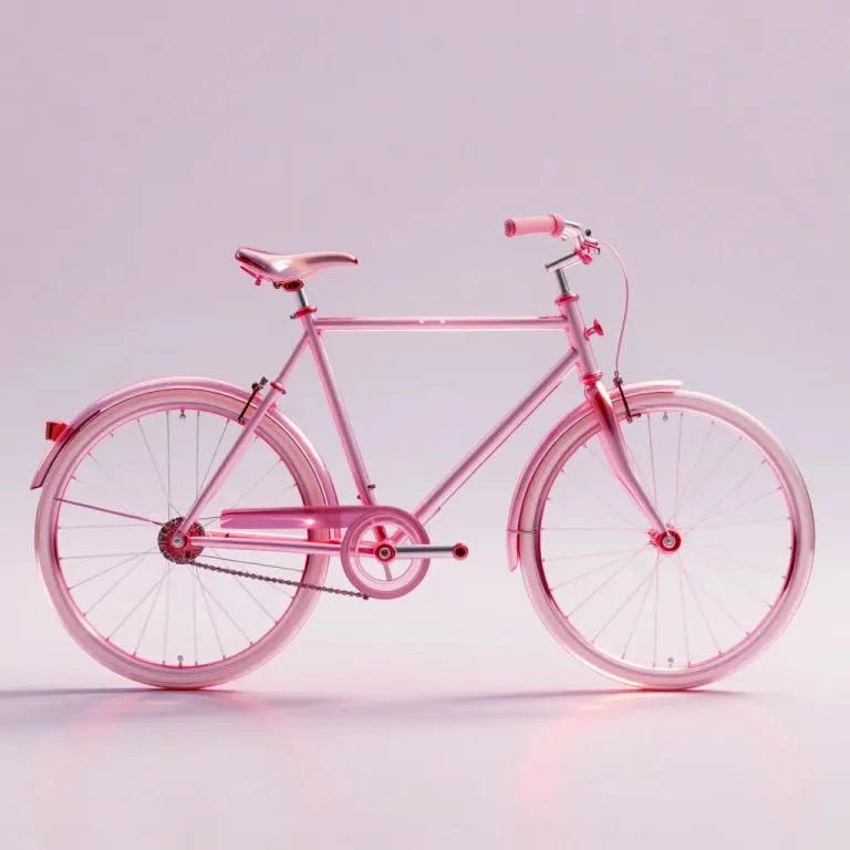 A crystal-clear pink bicycle gleams under soft, diffused light, highlighting its glossy, reflective surface. The minimalist, pure white background provides ample copy space, ideal for branding or product display.