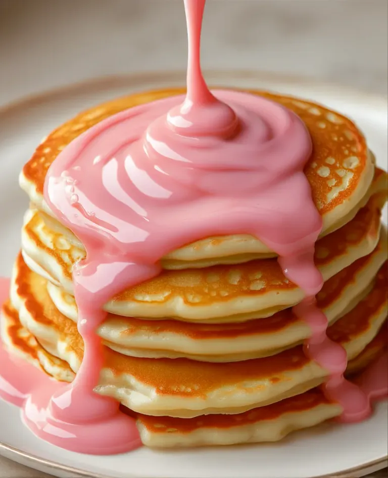 A stack of golden brown pancakes is being drizzled with glossy pink sauce, creating a vibrant and appetizing scene. The soft shadows and warm lighting highlight the texture and color contrast, making the image visually striking and ideal for culinary and food advertising.