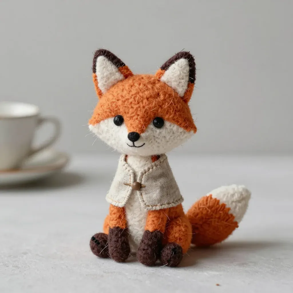 A handcrafted fox, with soft, fuzzy orange and white fur, sits upright in a beige jacket with a button, illuminated by soft, diffused light that highlights its features and creates gentle shadows. The blurred white table background with a teacup and saucer adds depth and context, making the image ideal for product or lifestyle content.