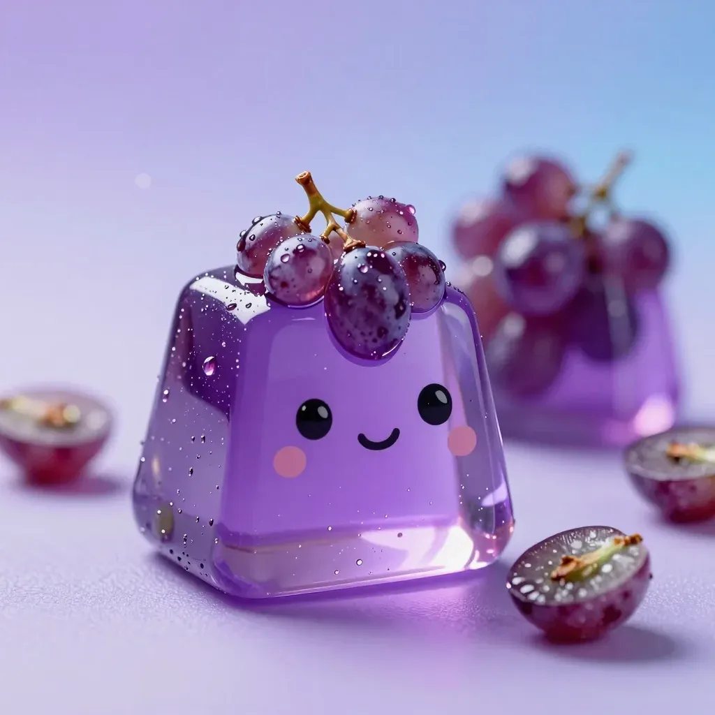 A translucent grape jelly prism with a cute face, adorned with fresh grapes, glistens under soft, diffused lighting, creating a glossy surface with water droplets. The shallow depth of field blurs the background, emphasizing the jelly's prominence and creating a clean, focused composition.