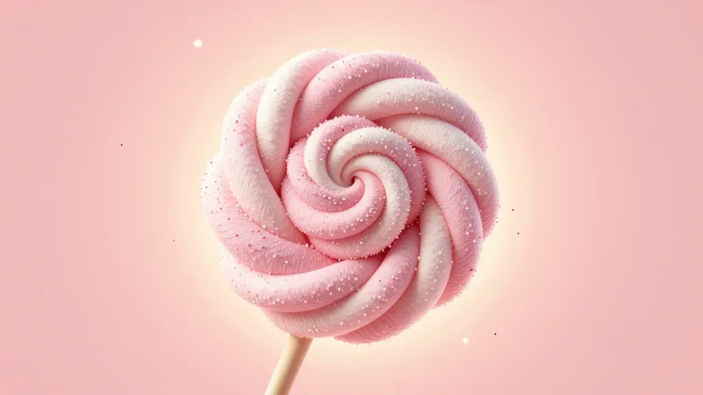 A close-up of a pink candy cotton swirl with a delicate sugar coating, softly illuminated by diffused light from above, creating a dreamy and inviting backdrop with a shallow depth of field.