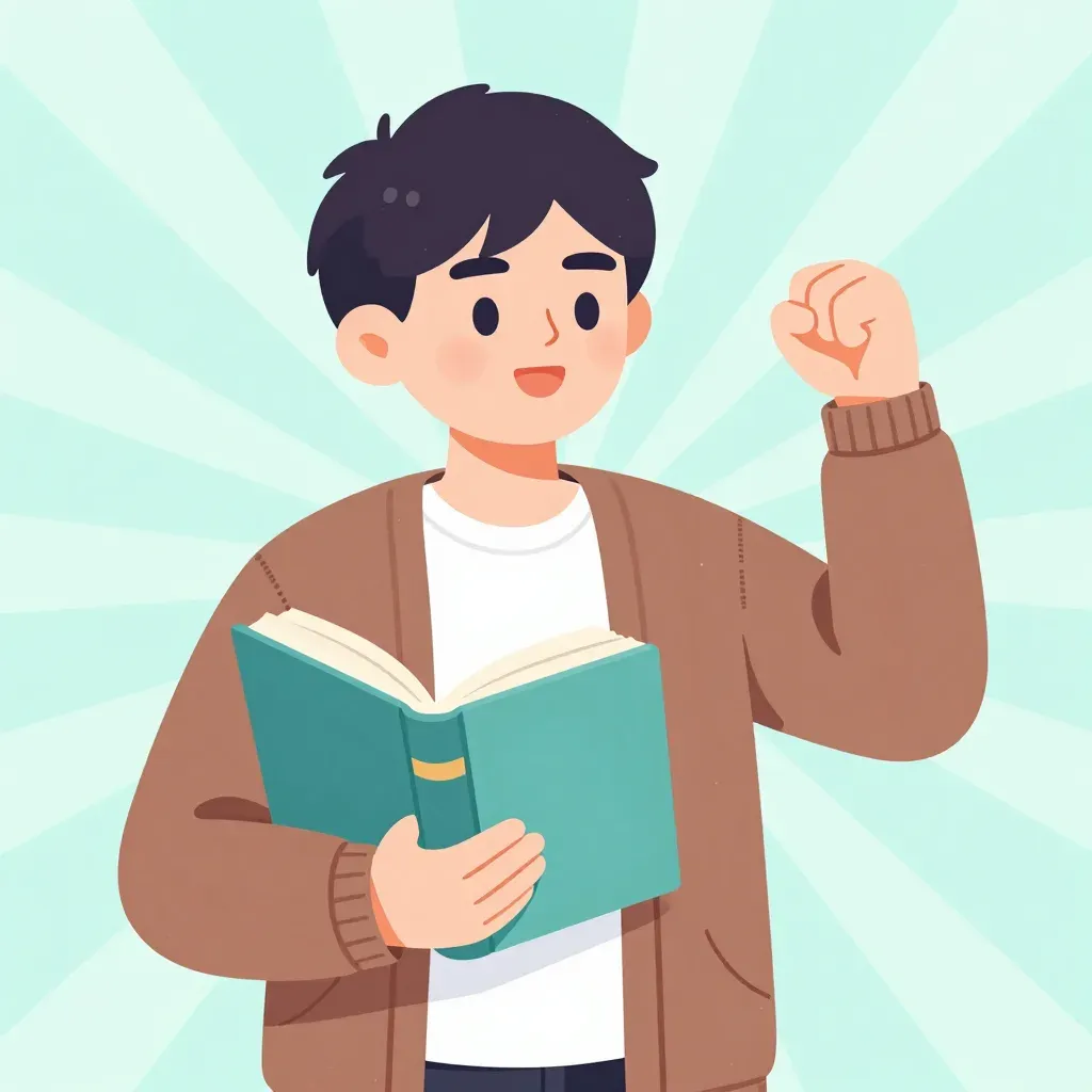 A young male student holds an open teal book while raising his fist in a celebratory gesture, his skin and clothing rendered with subtle sheen and soft textures. Radiant backlighting creates a halo effect, and the radial mint green background with clean copy space emphasizes focus on the subject.
