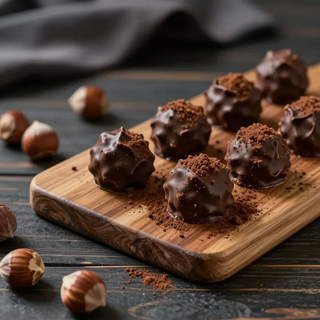 Glossy chocolate truffles dusted with fine cocoa powder are arranged diagonally on a weathered wooden board, surrounded by whole hazelnuts. Soft directional lighting from the upper left creates gentle highlights and subtle shadows, with a shallow depth of field emphasizing the truffles against a blurred dark wooden background.