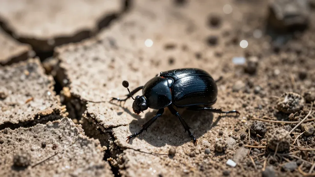 A glossy black beetle clings to the rough, dry surface of cracked earth, illuminated by direct sunlight that creates sharp shadows and highlights. The shallow depth of field blurs the background, emphasizing the beetle's glossy shell and the texture of the ground.