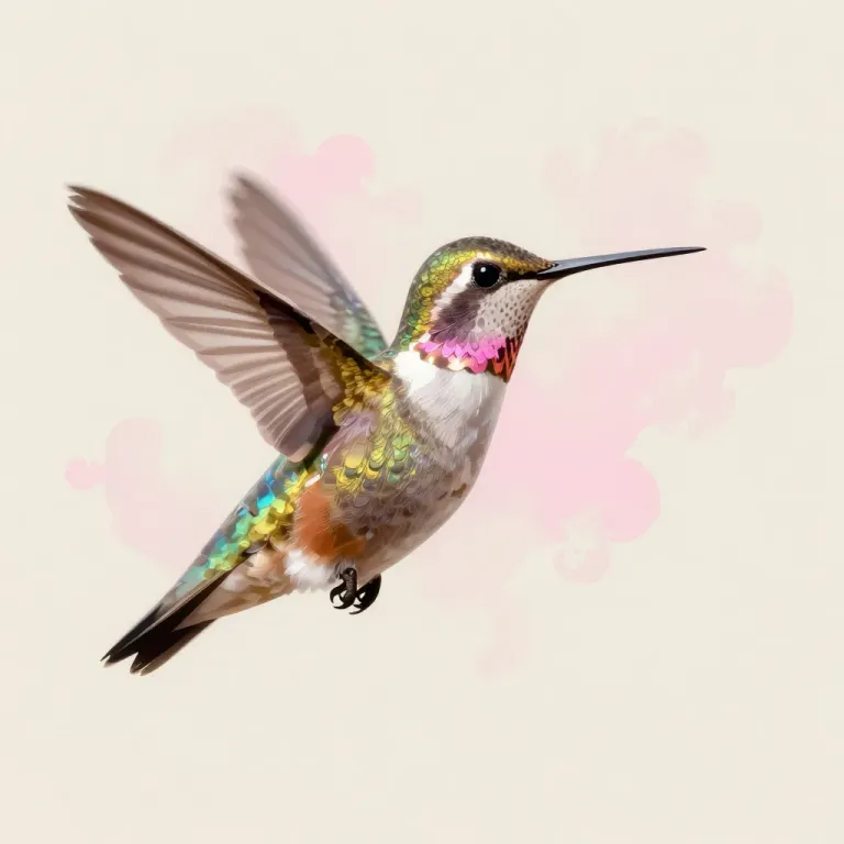 A hummingbird with iridescent pink and white chest feathers hovers gracefully, its wings in motion, against a soft, dreamy pastel pink and beige background. The diffused, soft light highlights the bird's glossy feathers and creates a gentle glow around it, emphasizing its delicate and textured plumage.
