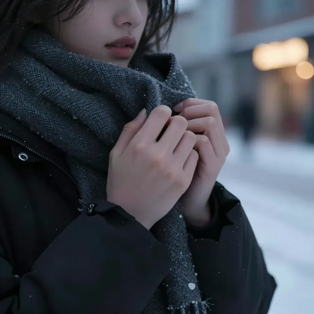 A person wraps a thick, textured scarf around their neck, standing on a snow-covered street illuminated by soft, diffused light from street lamps. The shallow depth of field blurs the background, focusing attention on the subject's hands and scarf.