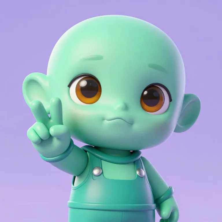 A friendly alien kid stands upright, raising a hand in a peace sign with glossy, smooth pastel teal skin. Soft, even lighting highlights the character's face and hand, creating gentle shadows against a solid lavender background.
