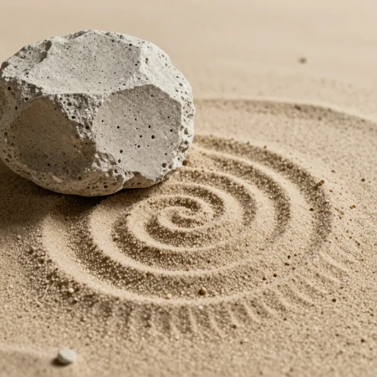 A rough, porous concrete stone lies atop a smooth, light beige sand spiral, illuminated by soft, diffused light that enhances the textures of both the stone and the sand. The shallow depth of field blurs the background, emphasizing the stone and spiral.