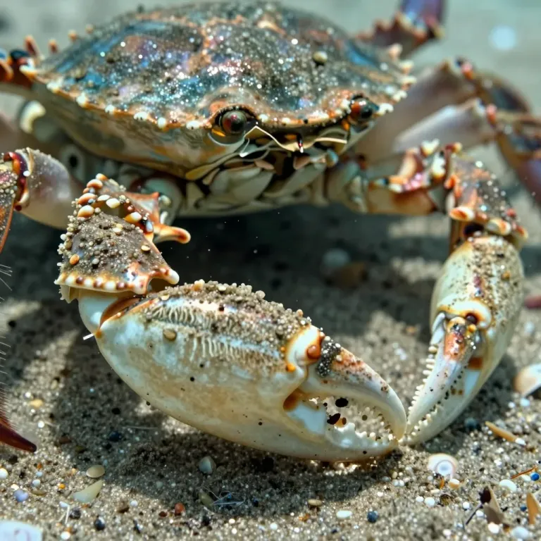 A close-up of a crab's claw, covered in fine sand, highlighting its rough, granular shell and spiky areas under natural, diffused lighting. The shallow depth of field keeps the focus on the claw while softly blurring the sandy beach background.