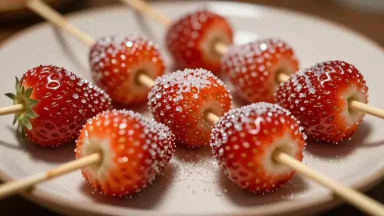 Soft, juicy strawberries coated in a crisp sugar glaze, highlighted by soft, diffused lighting that creates a warm, inviting glow. The shallow depth of field ensures the focus remains on the lollies, making it ideal for culinary or food photography.