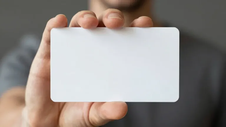A hand delicately holds a smooth, glossy white card against a soft, diffused light, highlighting the texture of the card and fingers. The shallow depth of field and blurred gray background create a clean, focused composition ideal for branding or product shots.