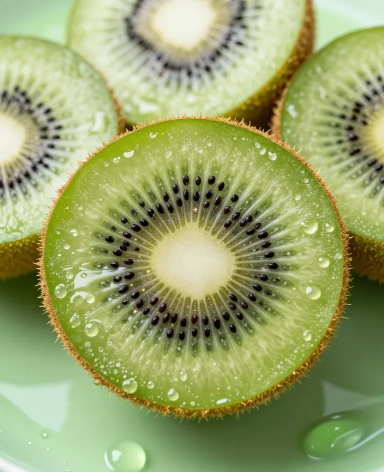 A close-up of a sliced kiwi with glistening dewdrops and a smooth, juicy interior, illuminated by bright, natural light that highlights the texture and glossy sheen. The blurred, greenish background emphasizes the kiwi slice, creating a shallow depth of field.
