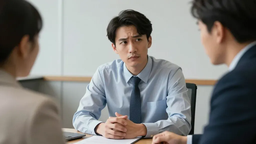 A young man in a light blue shirt and dark tie sits at a conference table, appearing attentive and engaged in a professional discussion. The soft, even lighting highlights the textures of his shirt and tie, creating a professional and focused atmosphere.