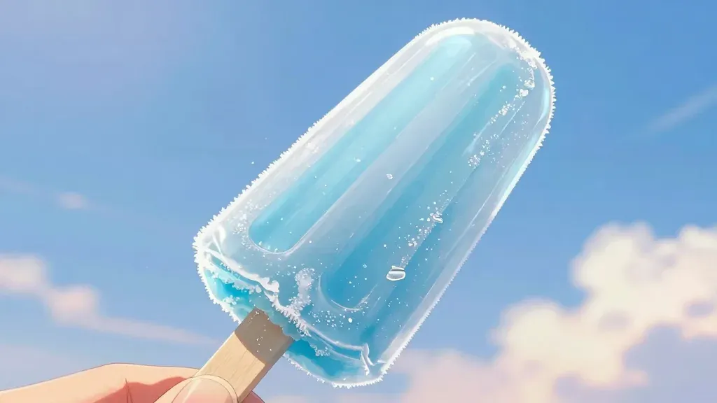 A hand holds a partially eaten popsicle with a creamy interior and frosty exterior, set against a bright, natural sunlight that creates highlights and reflections on the popsicle and hand. The composition is a close-up shot with a clear blue sky and scattered white clouds in the background, slightly blurred to emphasize the subject.