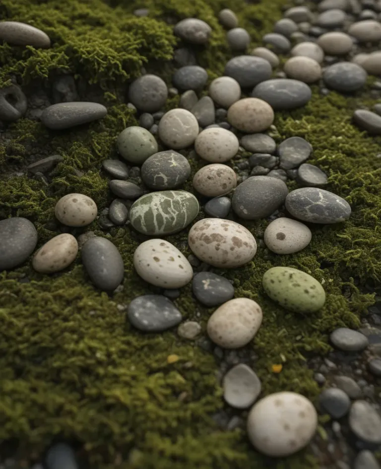 Smooth pebbles with a glossy sheen are nestled among vibrant green moss, illuminated by diffused, soft light that creates a gentle glow. The shallow depth of field emphasizes the textures and colors of the pebbles and moss, offering a serene and natural composition.