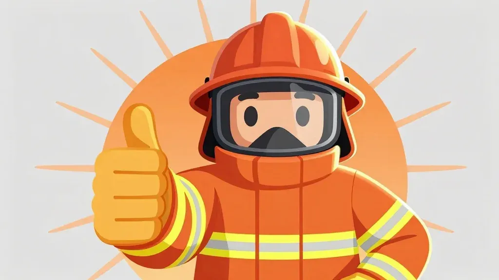 A firefighter in full protective gear, including a glossy orange helmet and matte turnout coat with reflective yellow stripes, gives a confident thumbs-up while wearing a textured leather glove. The subject is backlit with a warm sunburst effect, creating highlights on the helmet and shoulders, and the shallow depth of field blurs the soft gradient background, emphasizing the centered figure.