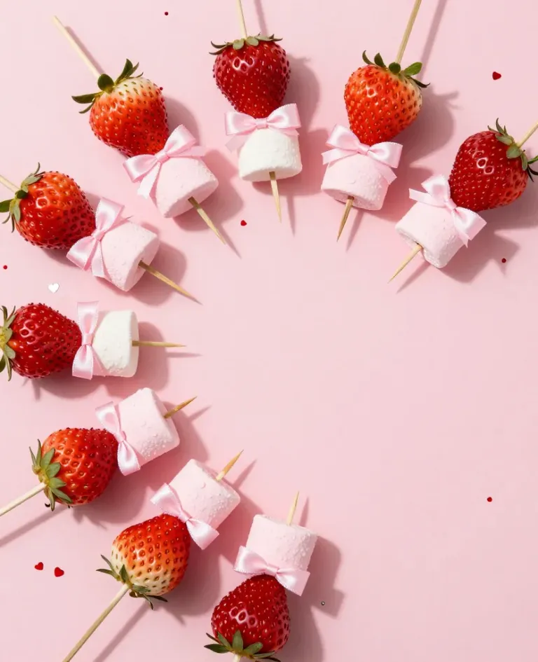 Glossy strawberries and soft marshmallows are arranged on skewers with delicate pink bows, creating a visually appealing and symmetrical frame. The soft, diffused lighting highlights the textures and colors, while the clean pink background with subtle red speckles provides a minimalistic and elegant backdrop.