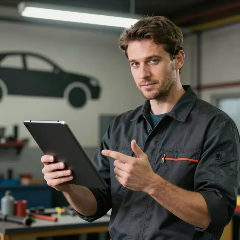 A male mechanic in a black work shirt holds a tablet and points at its screen while looking directly at the viewer, his face showing soft stubble and focused expression. Overhead fluorescent lighting creates even illumination with soft shadows, and a shallow depth of field blurs the background tools and shelves, emphasizing the subject.
