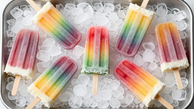 Brightly colored rainbow popsicles rest on a bed of clear ice, creating a refreshing and vibrant display. The even lighting highlights the glossy texture of the ice and the creamy coating of the popsicles, enhancing their visual appeal.