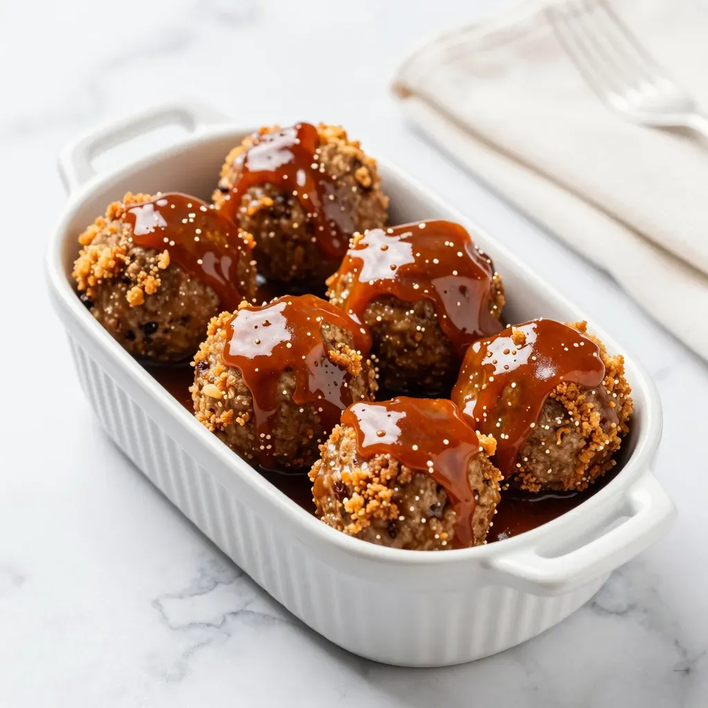 Eight meatballs with a rough breadcrumb coating are coated in a thick, glossy sauce and arranged diagonally in a white ribbed ceramic dish. Soft diffused lighting highlights the sauce's sheen and creates gentle shadows, while a shallow depth of field blurs the marble background and out-of-focus napkin and fork, emphasizing the dish's central composition.