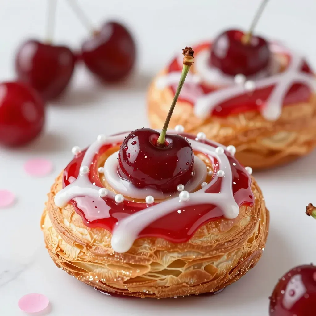 A close-up of a flaky pastry adorned with a glossy cherry glaze, smooth icing, and decorative pearls, highlighted by soft, diffused lighting that accentuates the textures and glossy surfaces. The shallow depth of field and minimalistic white background emphasize the pastry's intricate details and vibrant colors.