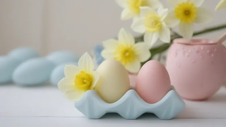 A pastel-colored egg carton holds three glossy eggs, surrounded by delicate daffodils, under soft, diffused lighting that highlights the textures and colors. The shallow depth of field and blurred background create a serene and elegant composition.