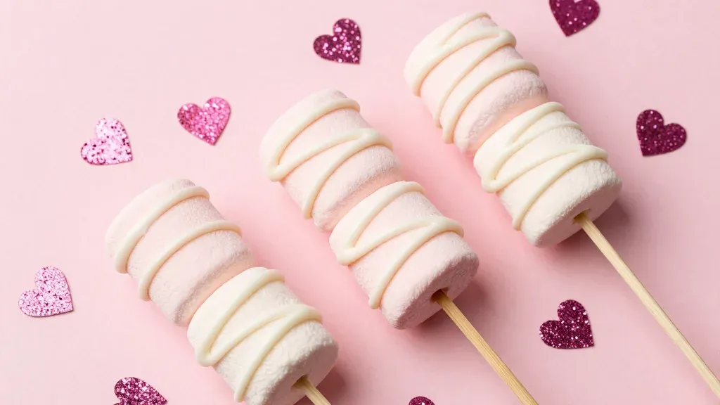 Three marshmallow skewers with glossy white chocolate drizzle arranged diagonally, showcasing soft fluffy texture and smooth viscous chocolate patterns. Soft front-top lighting creates subtle highlights and gentle shadows, with a shallow depth of field and scattered glitter hearts enhancing visual interest without distraction.