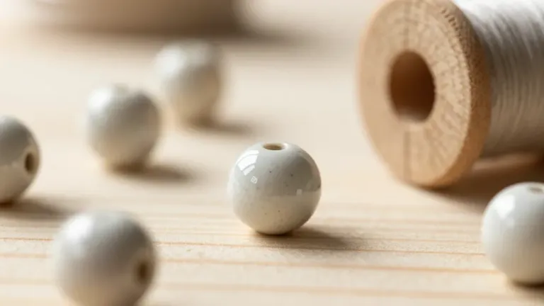 Glossy white ceramic beads with subtle surface variation are scattered across a wooden surface, with a smooth wooden thread spool and fine fibrous thread in the background. Soft directional lighting from the upper left creates gentle highlights and shadows, while shallow depth of field isolates the central bead in sharp focus against a blurred wooden backdrop.