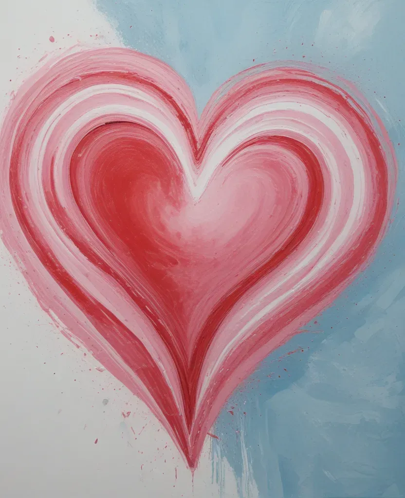 A heart painted with thick, creamy strokes in red and white, set against a soft, light blue and white background. Gentle overhead lighting casts subtle shadows, creating a serene and dynamic composition.