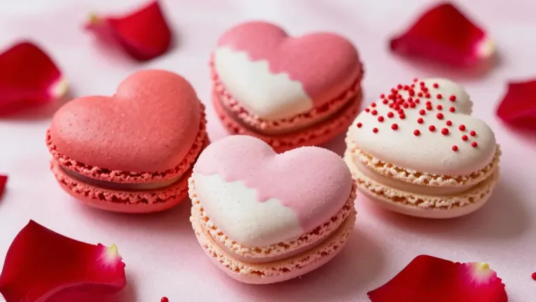 Delicate heart-shaped macarons with glossy pink and white shells, filled with a smooth, creamy filling, arranged against a clean white background with blurred rose petals, creating a romantic and elegant setting. The soft, diffused lighting highlights the texture and color of the macarons, emphasizing their delicate nature and the gentle shadows they cast.