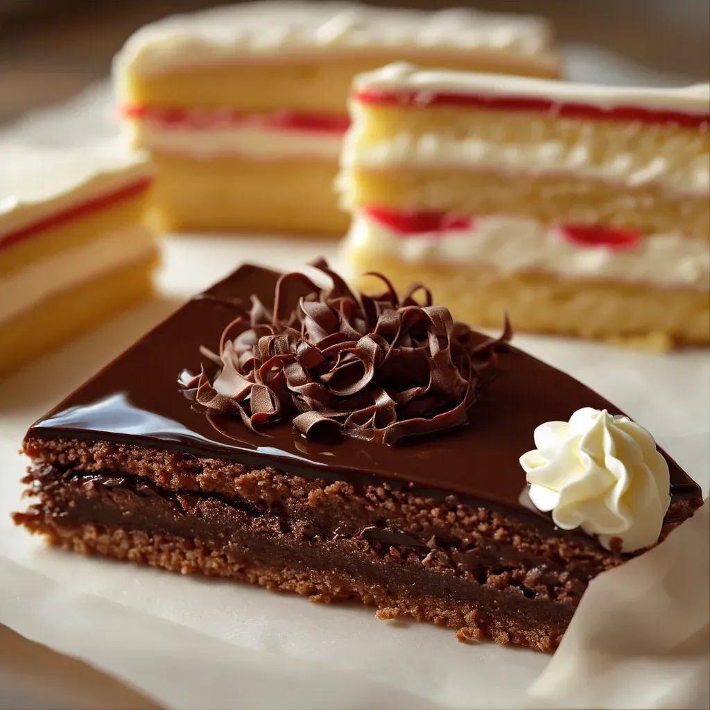 A slice of chocolate tart with a glossy ganache topping and whipped cream garnish, set against a warm, soft-lit background that enhances the glossy texture of the ganache. The blurred background of additional cake slices suggests a bakery setting, providing a clean and inviting atmosphere.